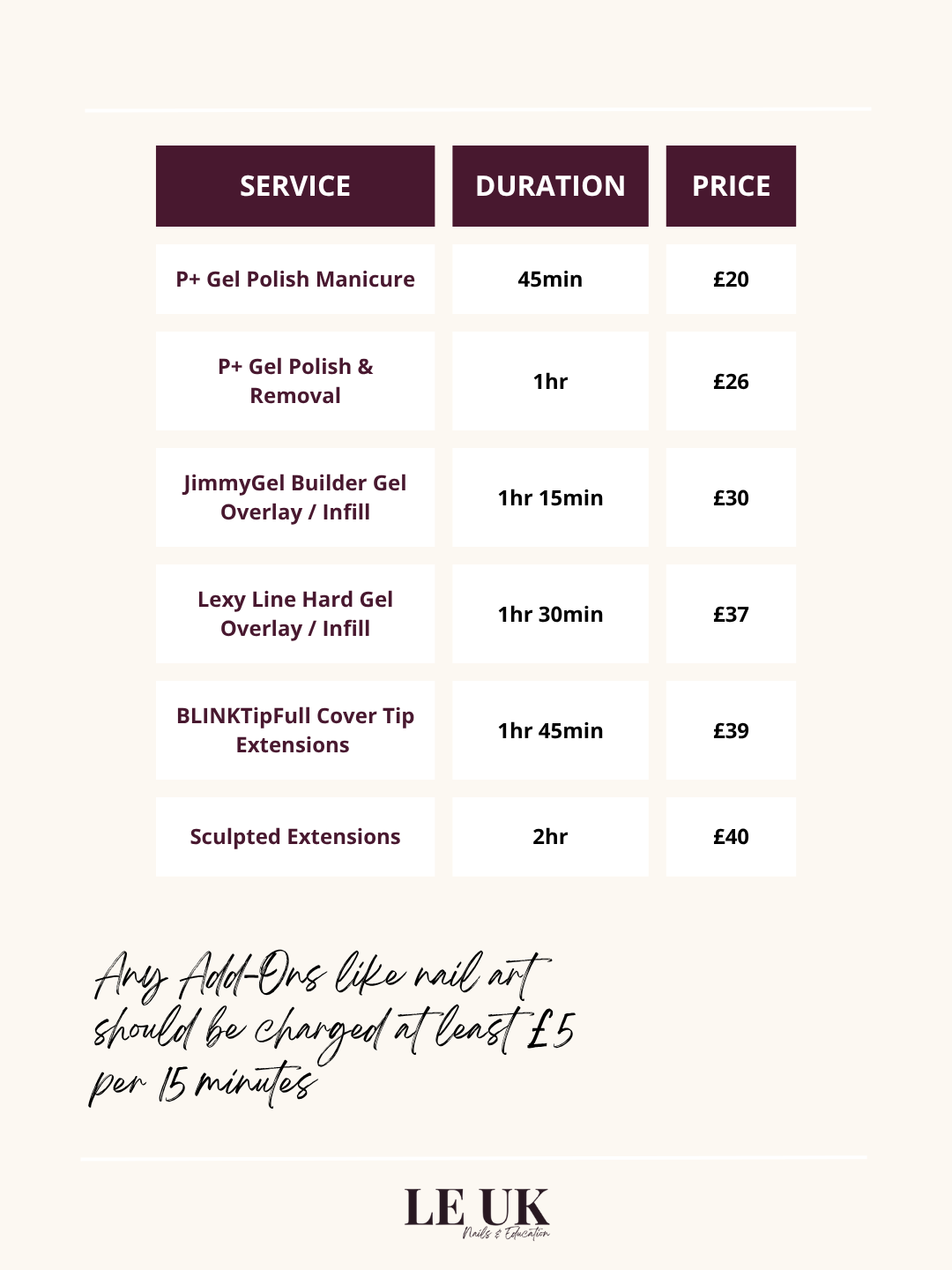 At Light Elegance UK, we’ve calculated the minimum recommended prices for nail professionals using our products, based on: