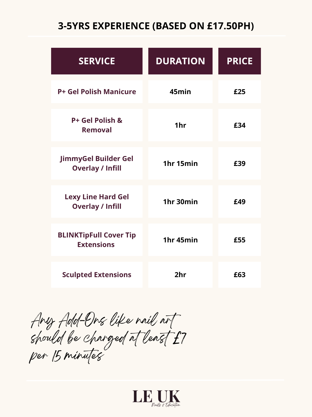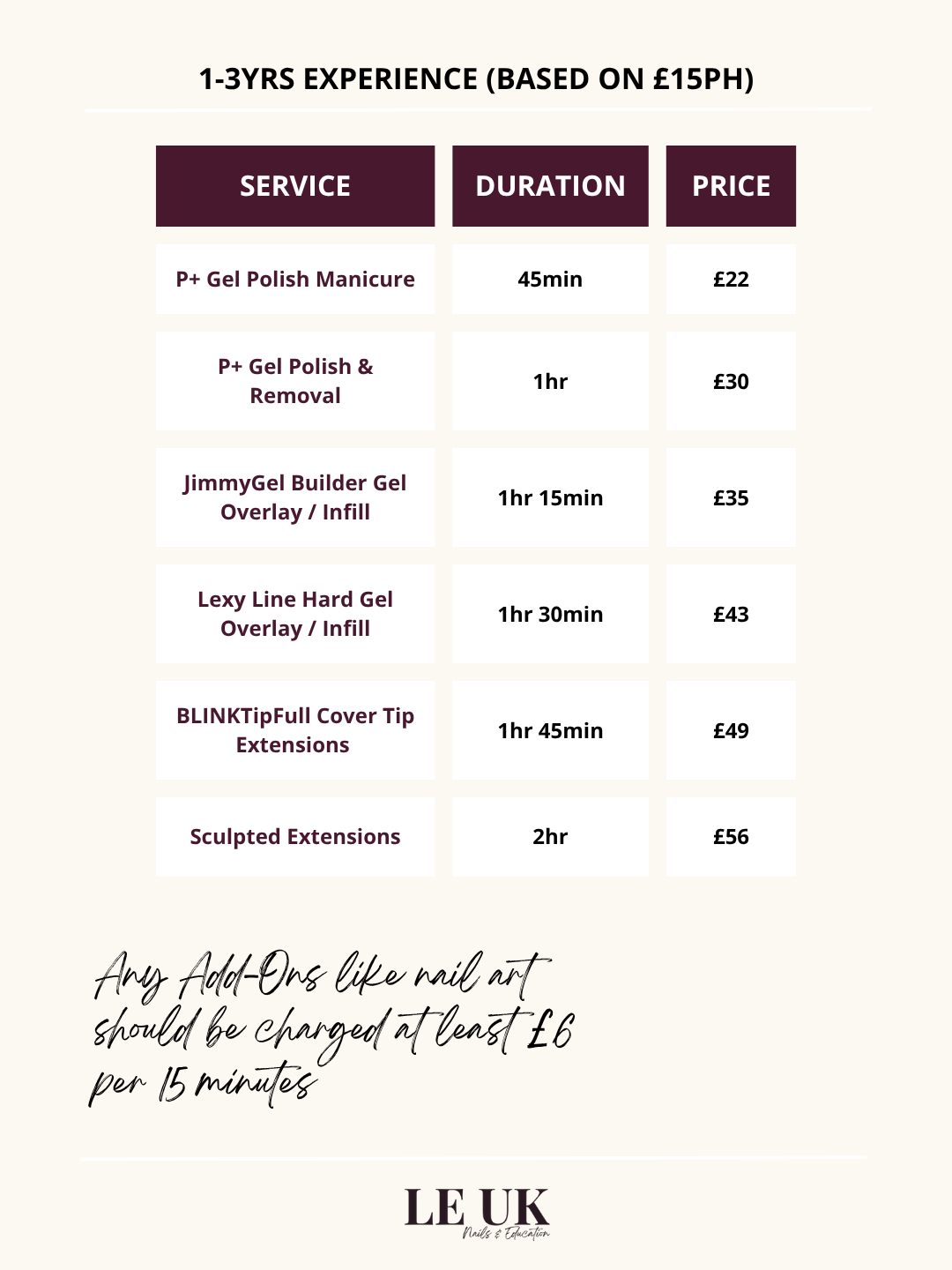 This is your starting point. At this stage you’re building confidence, practising routines and learning how long each service takes you. Your prices reflect the early stage of your journey and help you cover basic costs while gaining experience.